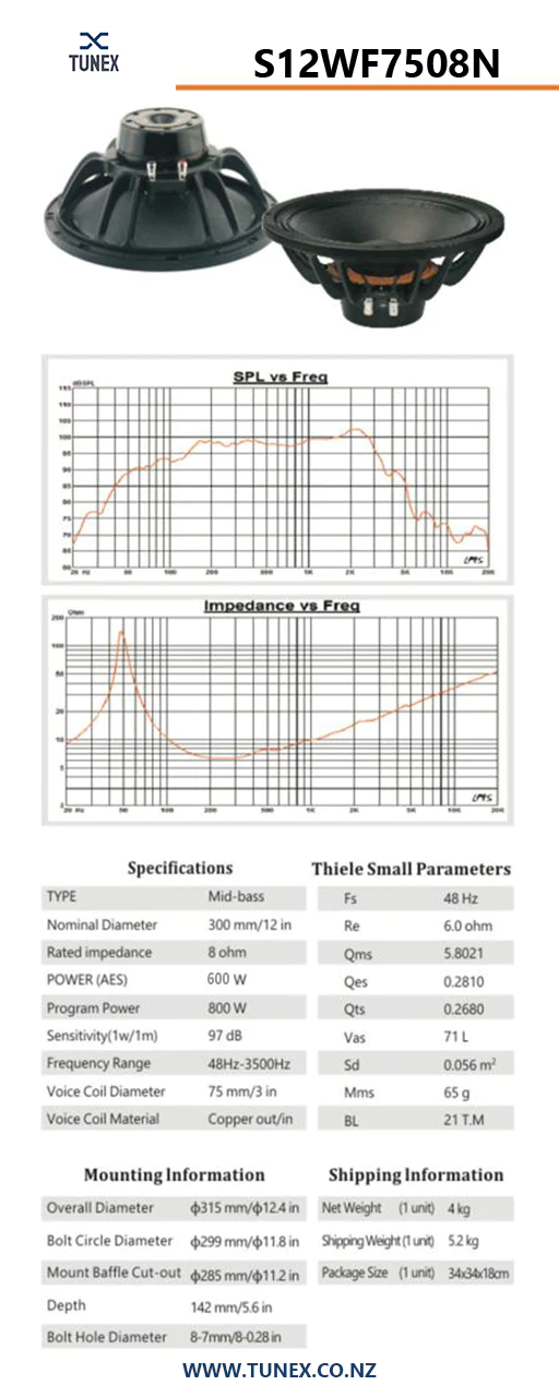 S12WF7508N 12″ Speaker Mid 600w RMS- 8Ohms – Neo Magnet